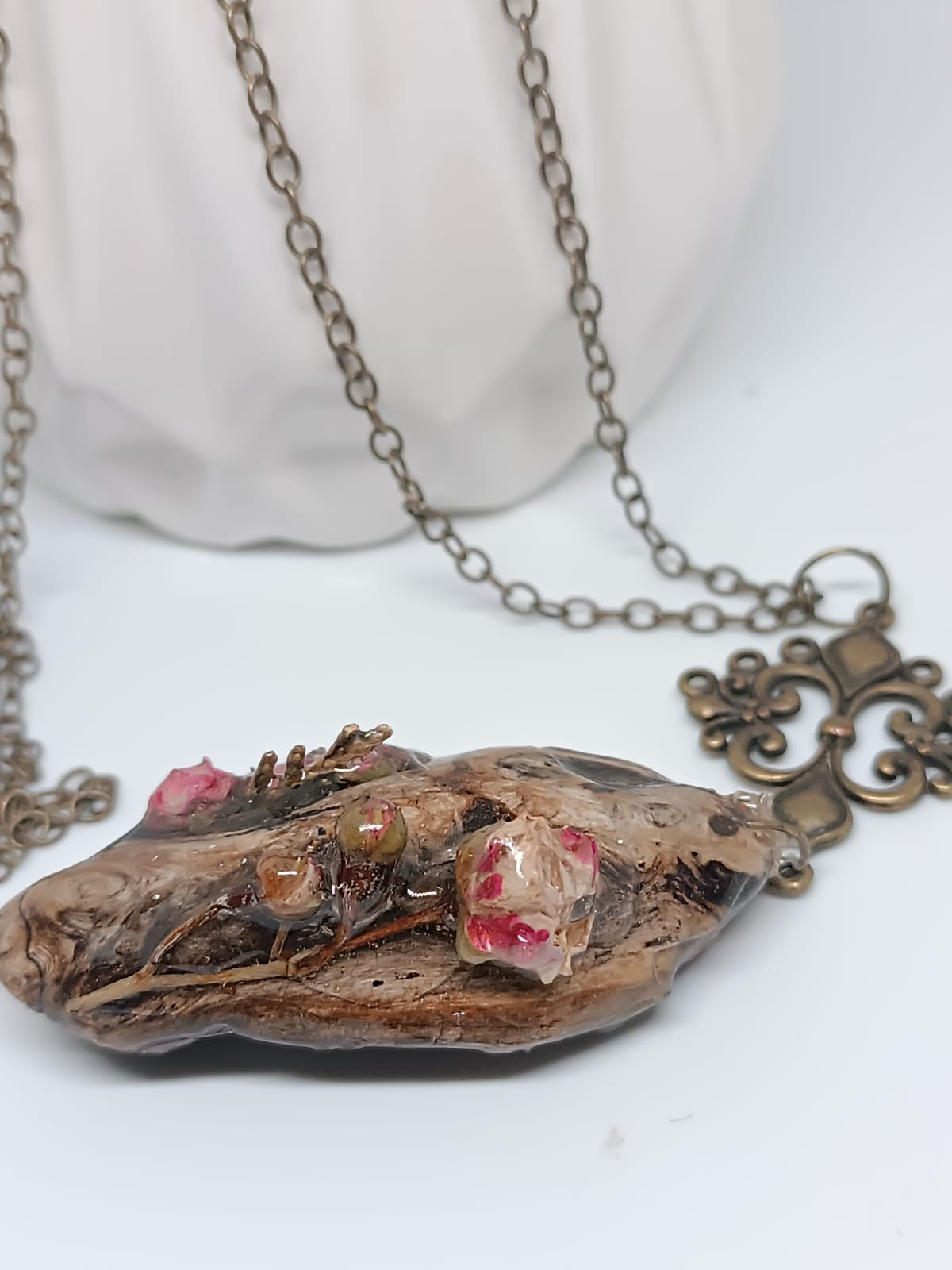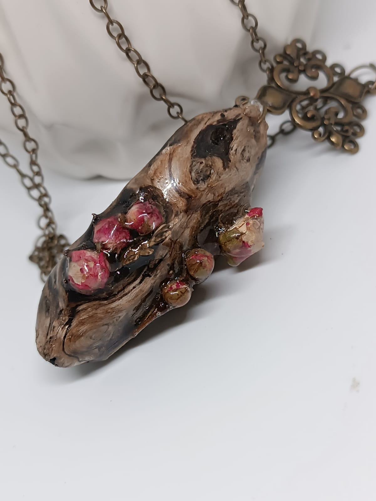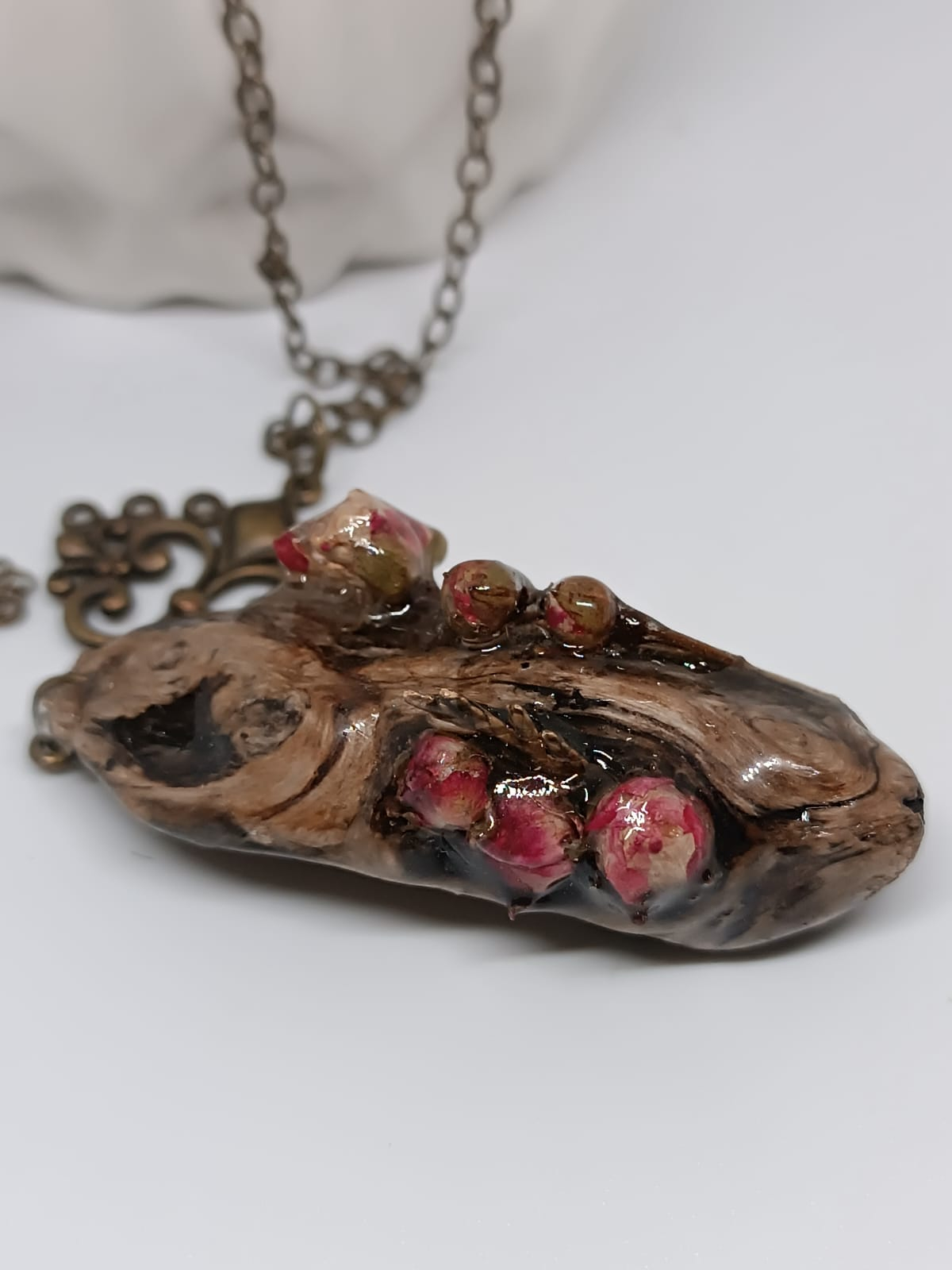 Pandantiv pe lemn cu boboci de trandafir glazurați în rășină epoxidică