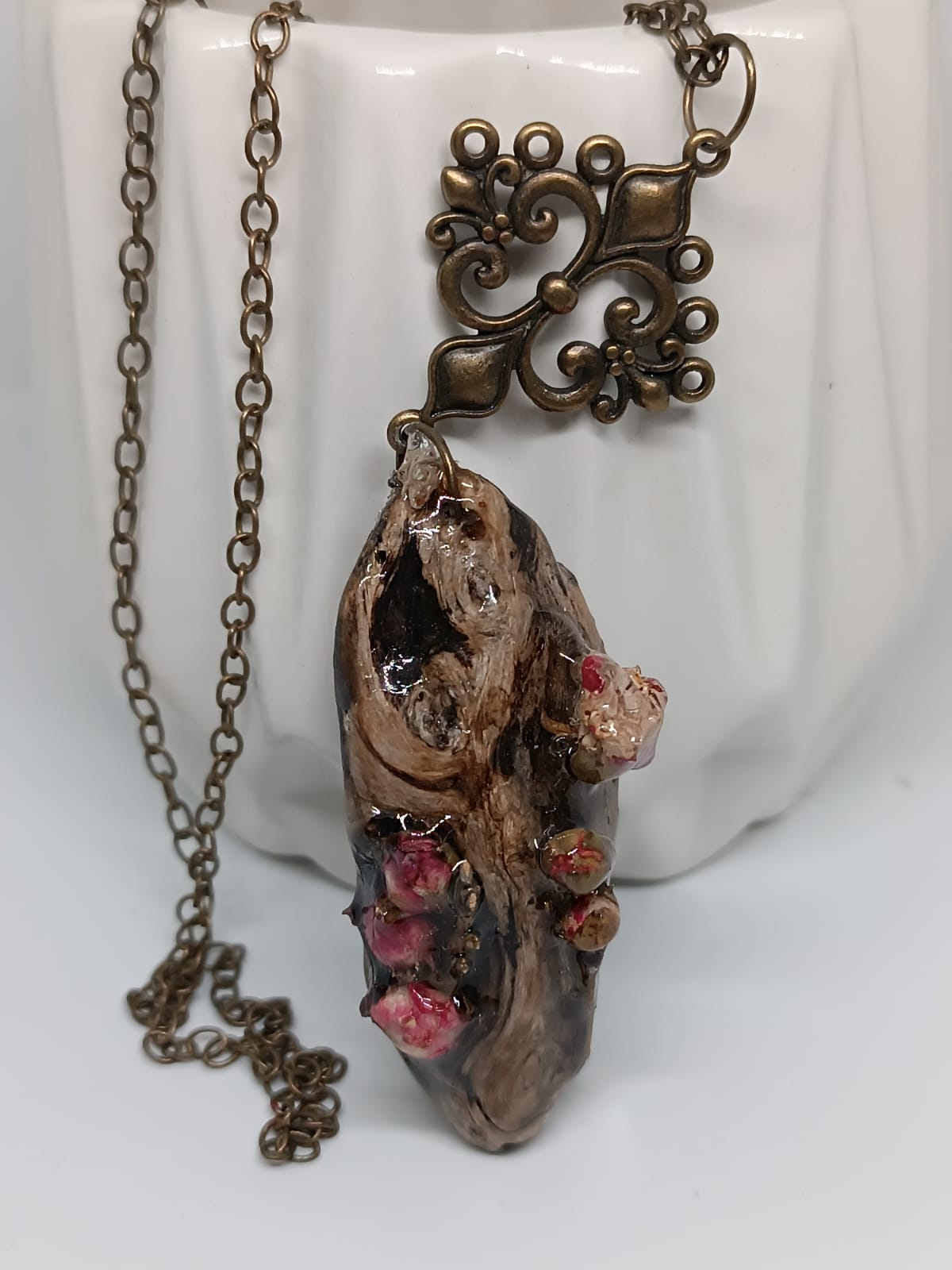 Acest pandantiv este o bijuterie unică, o declarație de stil ce aduce un omagiu frumuseții contrastante a naturii. Lucrat manual, cu mare atenție la detalii, pandantivul îmbină căldura naturală a lemnului cu delicatețea romantică a trandafirilor, pentru un accesoriu elegant și sofisticat.